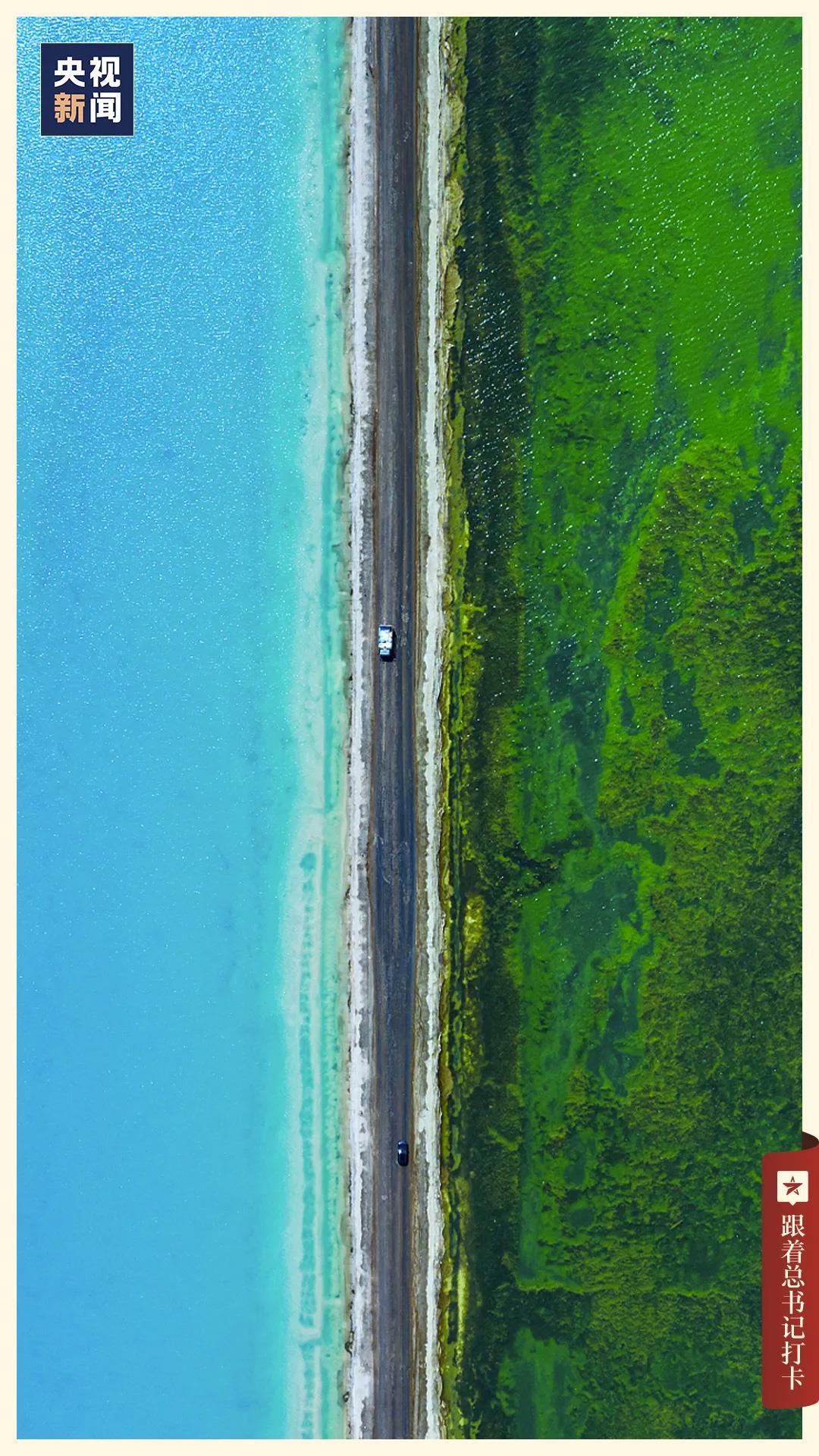 G315国道把西台吉乃尔湖一分为二,一边是绿色,一边是蓝色,成就了经典的“双色公路”。