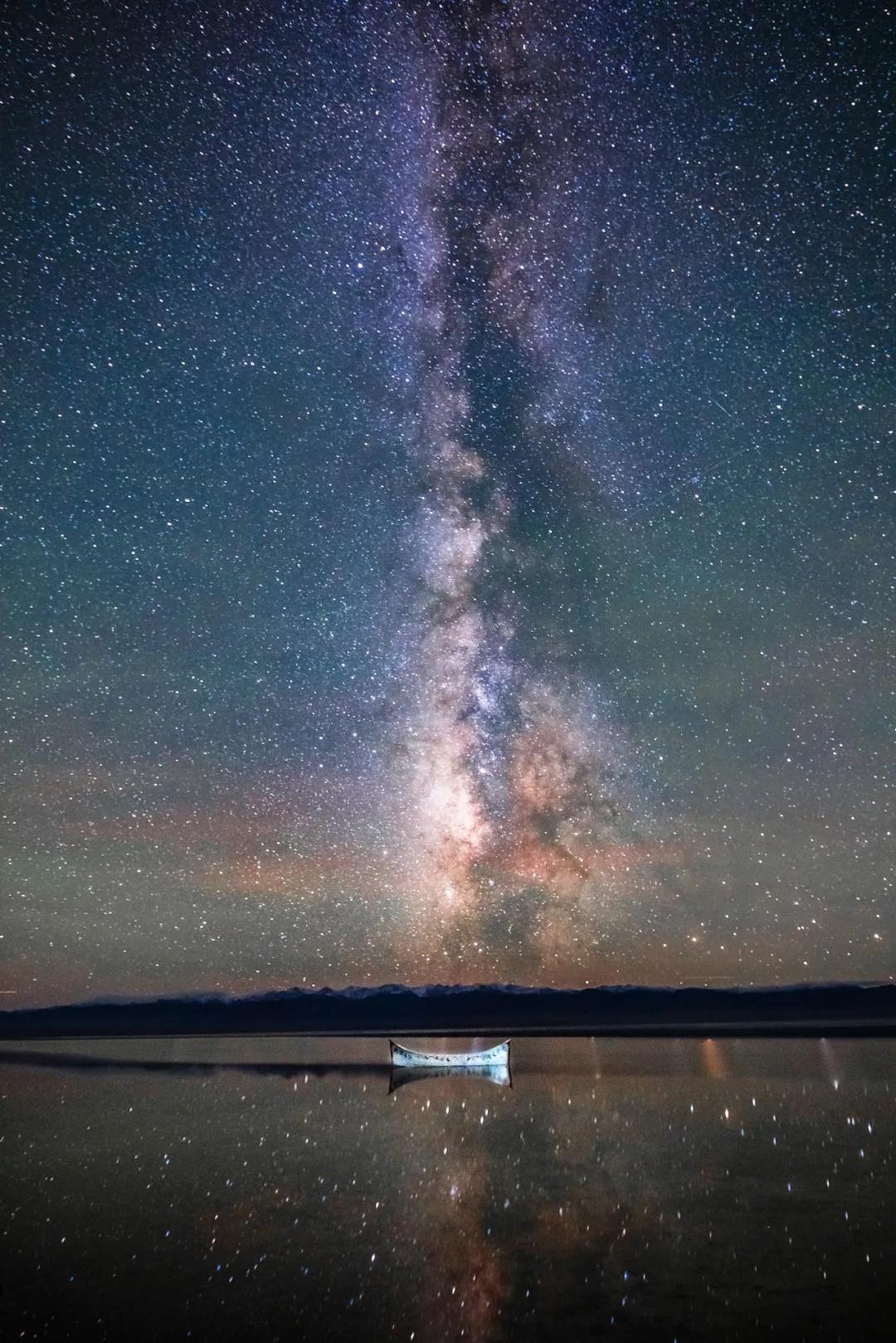 青海海拔较高,大气比较稀薄,夜晚更容易清晰地看到星空。茶卡盐湖同时还是“夜空之镜”,当银河与湖水中的倒影连在一起,画面梦幻又璀璨。
