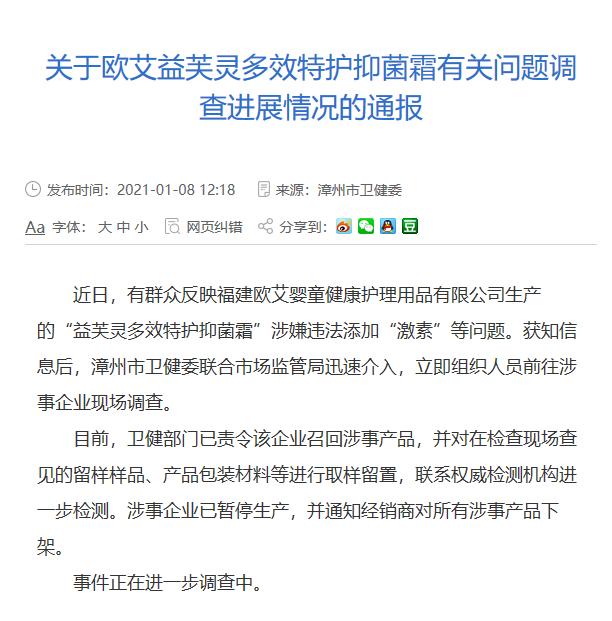 福建漳州回应“婴儿用抑菌霜成大头娃娃”: