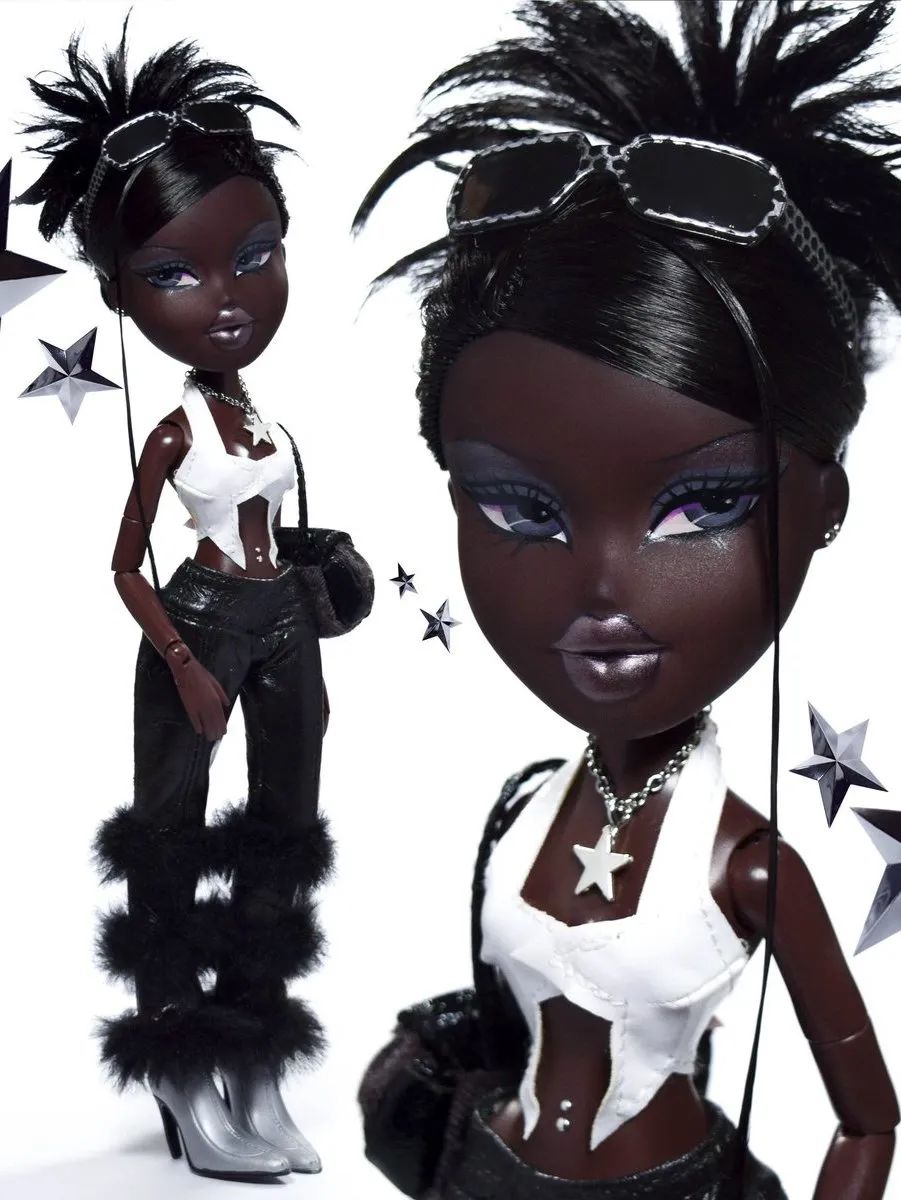 以暗黑机能风闻名的Mowalola为Bratz特别创作了和秀场模特几乎一模一样的超短皮夹克、防水台长靴、镂空解构连衣裙;