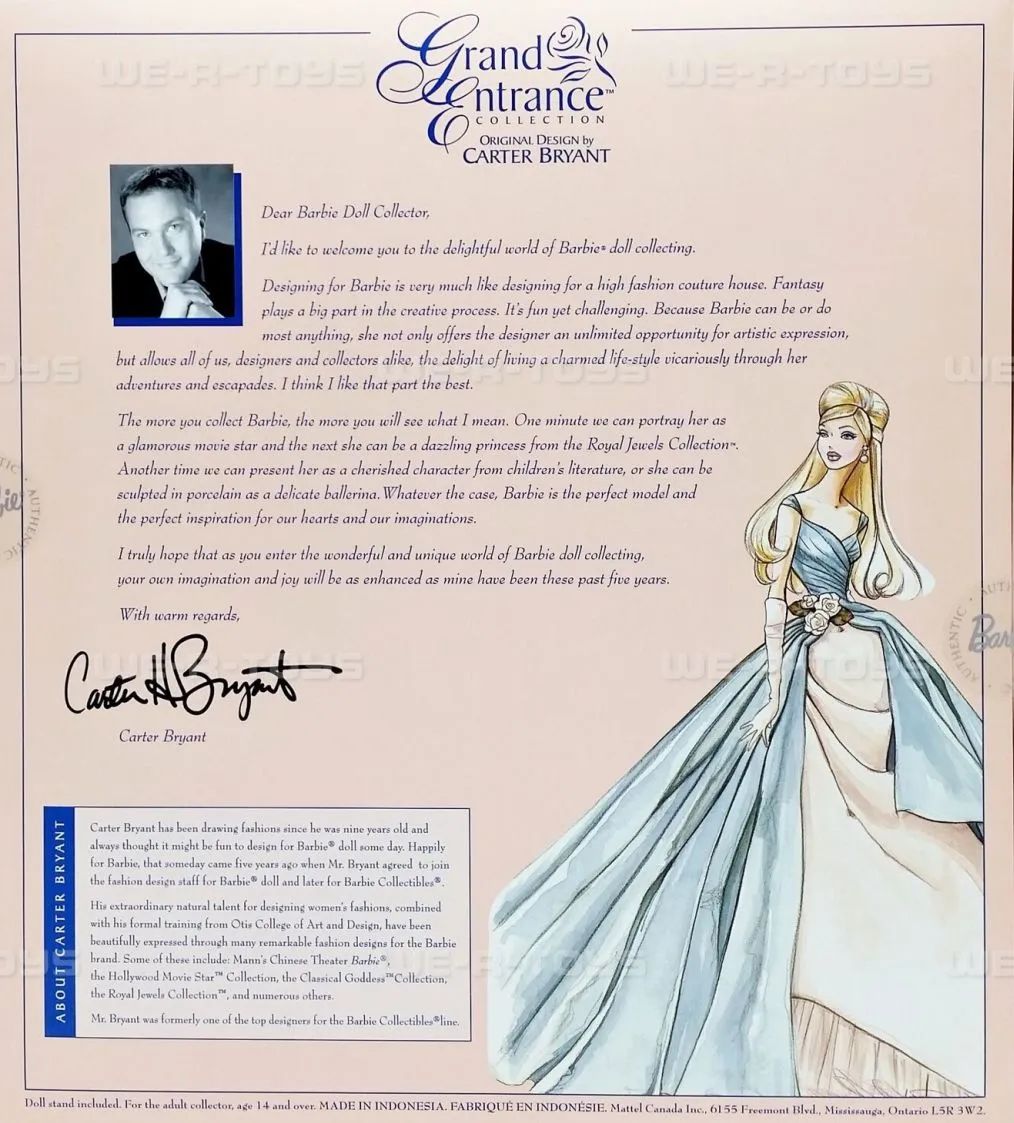 ● Carter Bryant为芭比娃娃设计的梦幻礼服裙,他的名字也留在了大量珍藏版芭比的盒子背面