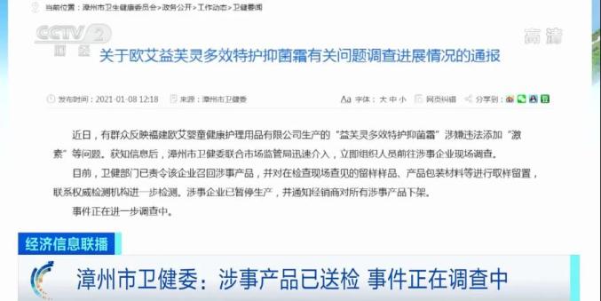 1月11日下午,漳州市与连云港市卫健委互相通报了最新调查及掌握的情况,并召回了涉事企业福建欧艾婴童健康护理用品有限公司的129盒产品,其中“益芙灵”97盒,“开心森林”32盒。