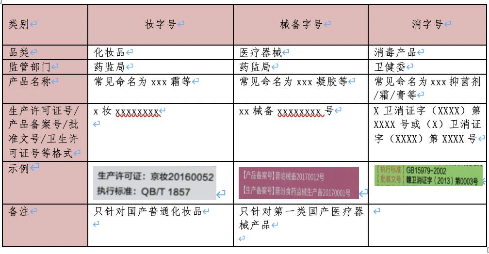 市面上常见的宝宝护肤产品按类别大致可分为三类:一类为“妆字号”产品,一类为“械备字号”产品,一类为“消字号”产品。如何区分这几种字号的产品呢?这些字号到底代表什么呢?消费者可通过产品外包装上展示的信息进行识别和区分不同字号的产品,详情请见下表。