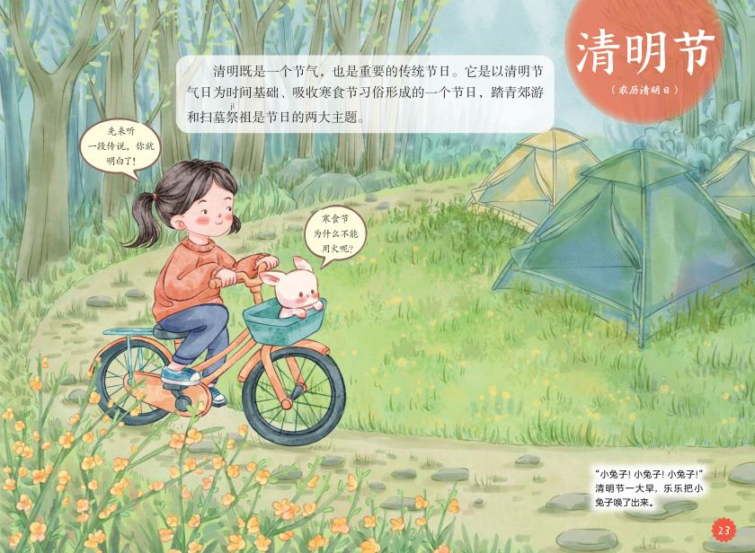 为了让本书更加有趣,我们还设置了乐乐和小兔子两个角色。和很多节日科普读物中儿童往往是被教导者不同,这本书让乐乐代表的儿童成为过节的主角。这能引导和乐乐同龄的小读者们更加主动地了解节日文化,参与节日活动。小兔子的设置不仅增加了本书的趣味性,而且进一步强化了儿童的过节主体性。小兔子总是随节日的到来而出现,这有助于小读者理解节日作为特殊时间的意义和价值。小兔子不断向乐乐提问,也让我们的小读者和乐乐一起思考。