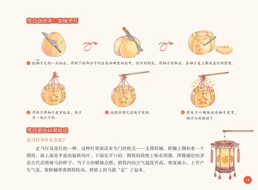 丰富多彩的节日活动为制作一本有意思、有趣的节日书奠定了扎实的基础。只要我们用合适的形式把节日本来就有意思、有趣的内容呈现出来,这本书就会是有意思、有趣的。为此,我们设置了节日传说、节日动动手、节日里的科学知识、节日习俗、汉字里的节日、俗语谚语里的节日、古诗词里的节日等多个板块,拓展读者对节日的认识和理解。尤其“节日里的科学知识”,能够启发、引导读者发现、探索生活中的智慧;“节日动动手”,能够引导读者亲自参与节日习俗活动,感受节日习俗的活泼可爱。