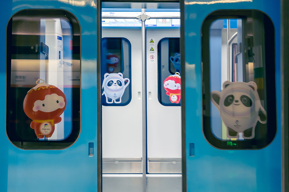 2022年1月18日,北京,冬奥会吉祥物冰墩墩、雪容融已“上岗”地铁11号线,列车上装饰一新,迎接冬奥会。常志韬/视觉中国 图