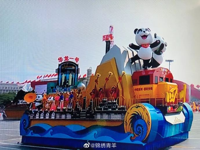 昂首前进的四川彩车——“逐梦兴川”格外引人注意。蓝黄为主调的彩车车头,两只憨态可爱的熊猫站在中欧班列——蓉欧快铁上方,展开双手喜迎四方。