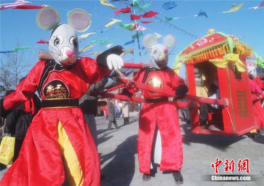 1996年2月,北京龙潭庙会上,“鼠”轿夫抬着娶亲的轿子鼓乐齐鸣,引得逛庙会的中外游客争着上轿当回“鼠新娘”。王瑶 摄