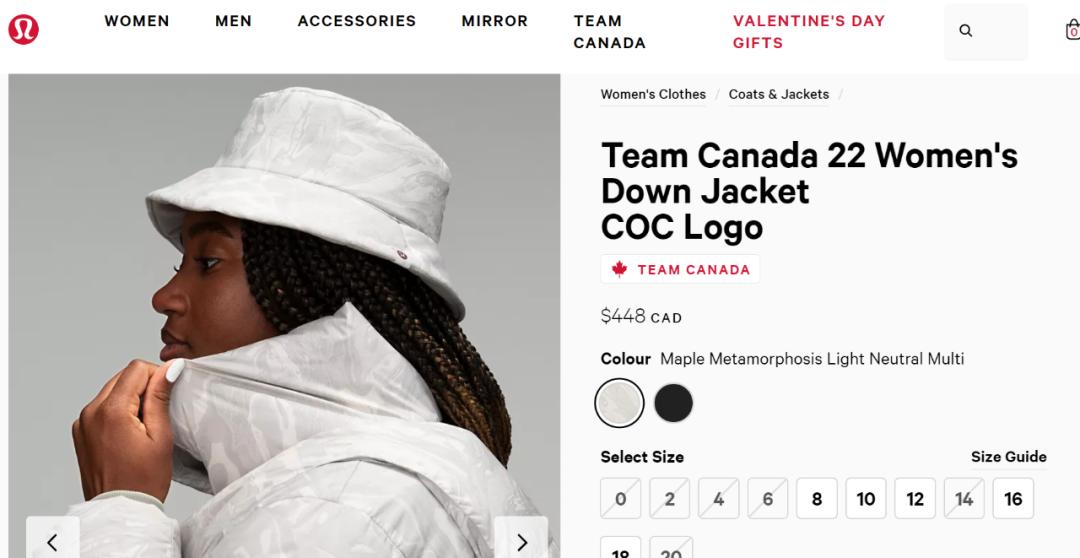 未来网记者在Lululemon品牌官网上看到,北京冬奥开幕式上加拿大同款队服系列中,仅有红色帽子、背包等同款在售。而主款羽绒服已无红色可选,仅剩白色、黑色,且多数尺码断货,售价在2000元人民币以上。
