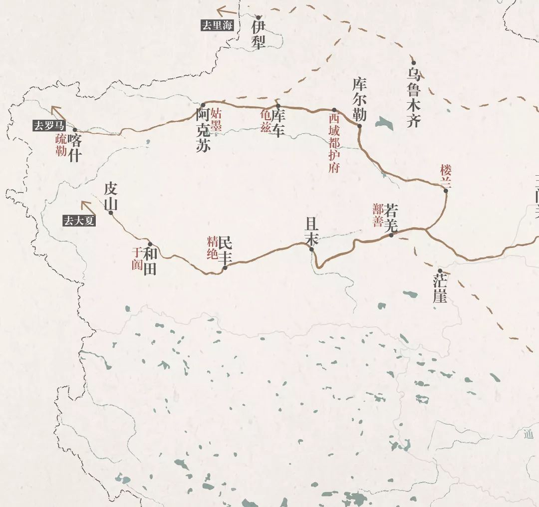 ▲西汉末年的丝绸之路线路图。(红色字为古地名)制图/Paprika