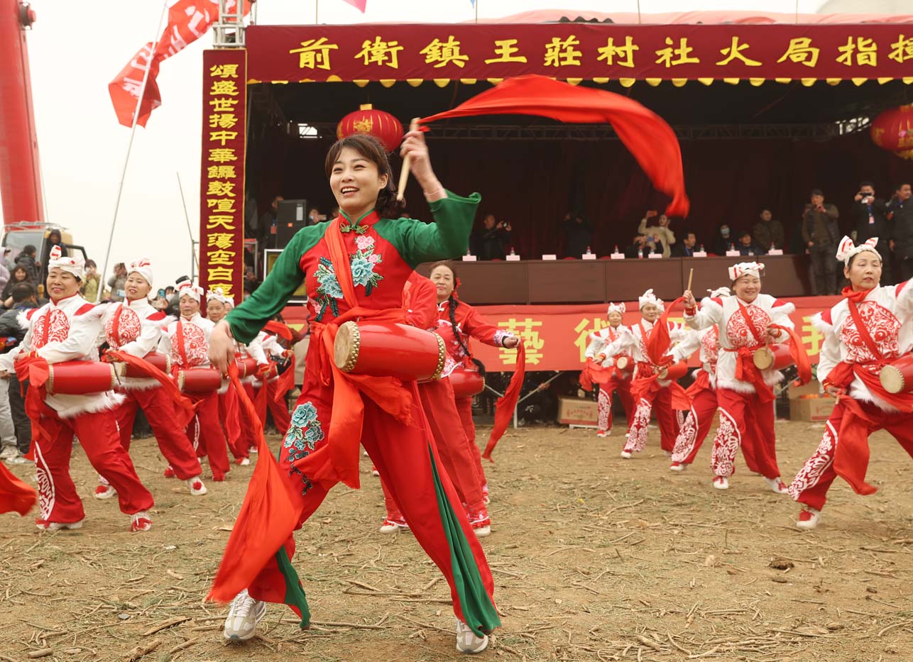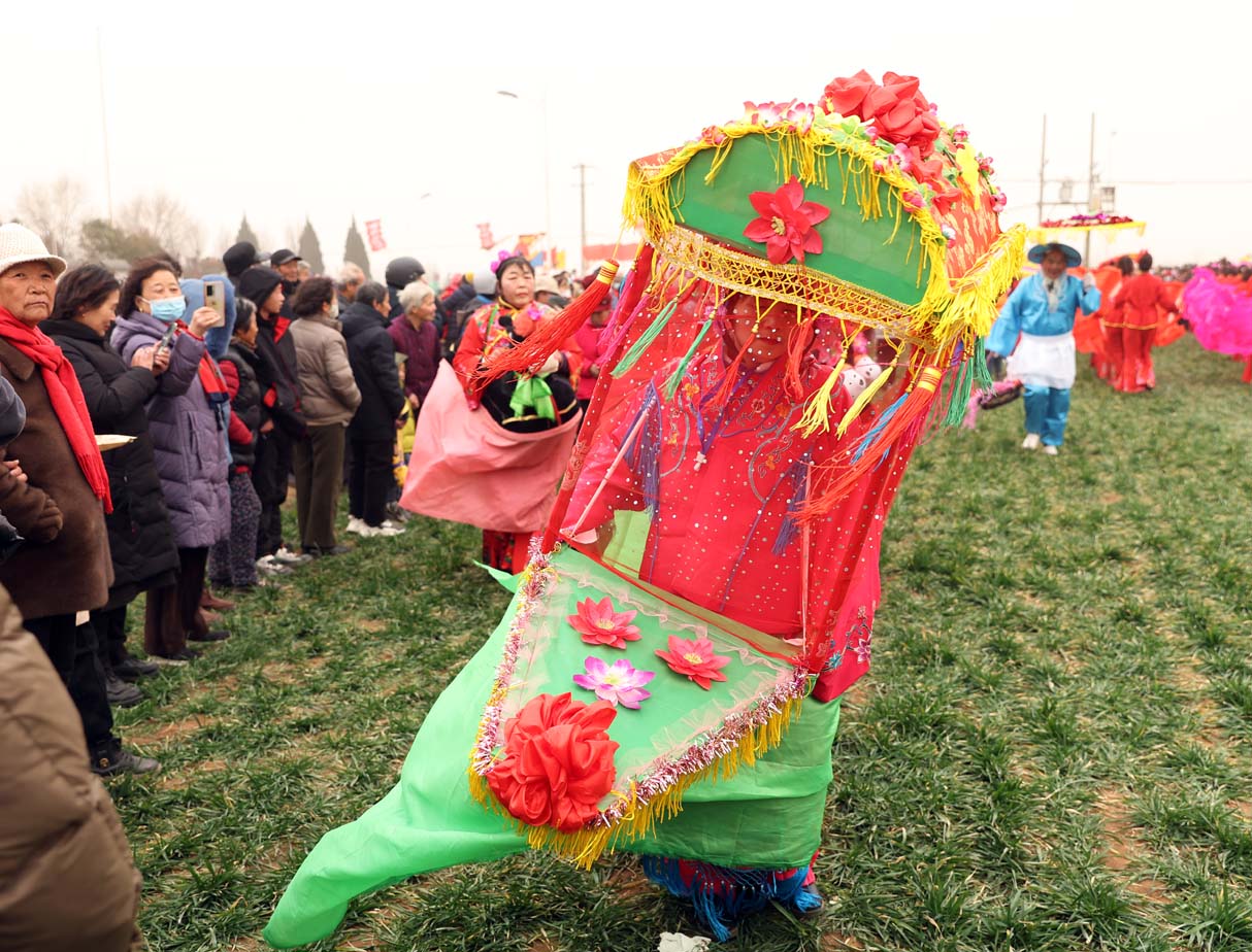 “快跑,南边开始扭秧歌了。”一名女孩朝着另一名正在举着手机拍人群的女孩喊了一声,两人随即转身朝东边一块麦地跑去。挤进人群,只见数十名穿着红颜色表演服装的女子举着花伞,正在绿油油的麦地里踏着鼓点扭着秧歌,队伍的后边跟着旱船和“毛驴”,他们夸张的表演动作逗得围观的人们哈哈大笑。