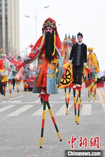 2月21日,兰州市永登县举行2024年社火进城展演活动,不少年轻人参与永登高跷表演。李亚龙 摄