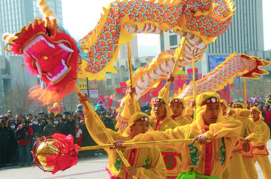 舞龙常用的队形有圆场、四门、舔龙、穿花、对盘、卷心菜、翻背花、结盘、反回盘、龙吃水、倒回龙、龙摆尾等。基本步法有游龙步、飞龙步、腾云步、碎步等,根据不同的队形变换运用。舞龙的众人要在引龙者和舞龙头者的指挥、带领下,通过各种队形和步法的变换,把龙的盘、翻、滚、游、穿、戏、咬、踏等多种动作表现出来。其中难度最大的就数龙头和龙尾。龙头本身就有相当重量,再加上人们层层缠裹上去的红绸和被面,就更重了,只有身强力健的男子方能擎起。一位在社火队里专门舞龙头的把式曾对笔者讲过,擎着龙头耍上一天,到了晚上两只胳膊抖得连饭碗都端不住。舞龙尾者在跑动时总是跑外圈,距离最远,所以也要体力好。