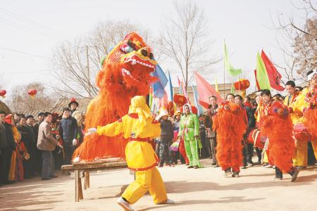 最后便是耍狮子了。拳棒手(武术拳师)威风凛凛,手持“小瓜灯”,或用五尺棍、铁连枷、九节鞭,引狮子绕场,打开场地,狮子顾盼望寻,咬痒、跳桌凳、上高杆、滚绣球,打完四门结束,但千万不能绊倒在院子里,这是有讲究的。