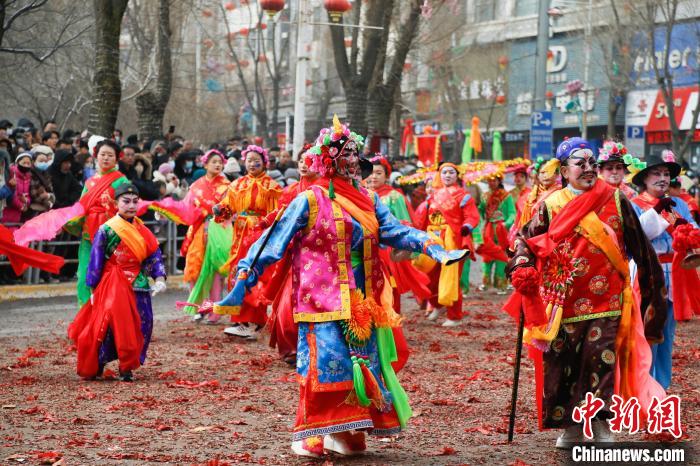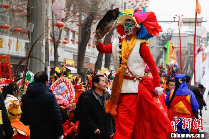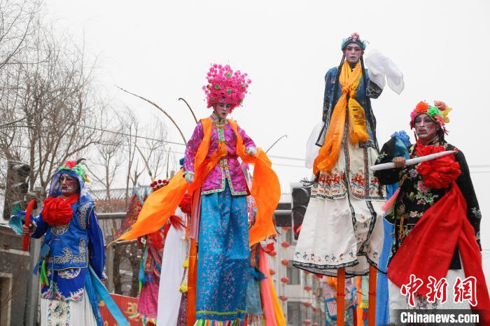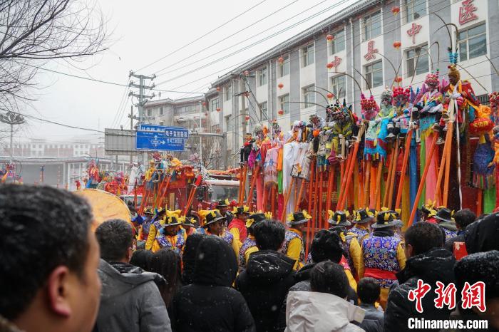 2月21日,中国农历正月十二,青海省西宁市湟中区进行社火巡演,伴随锣鼓鞭炮声,舞龙、舞狮、“大身子”、老秧歌、高跷等节目精彩上演,“杨六郎”“七仙女”“孙悟空”等70名高跷演员和500多名社火演员在降雪天气中为民众祝福祈愿。