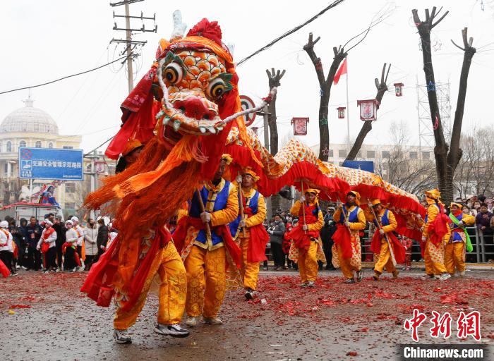 图为青海省西宁市湟中区社火巡演中的舞龙表演。 马铭言 摄