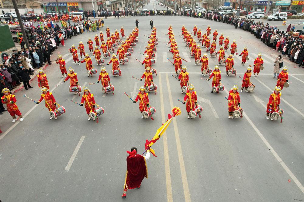 2月20日,在榆中县城关镇,兴隆山村社火队在表演太平鼓(无人机照片)。新华社记者 范培珅 摄