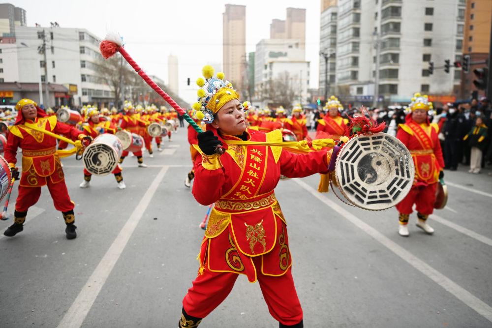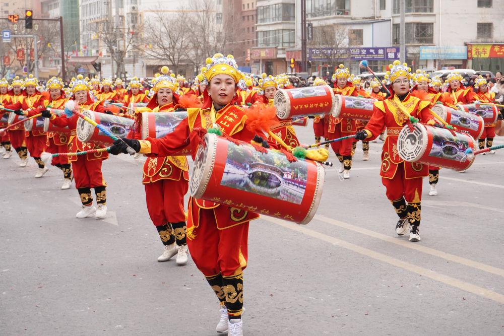 2月20日,在榆中县城关镇,兴隆山村社火队在表演太平鼓。新华社记者 马希平 摄
