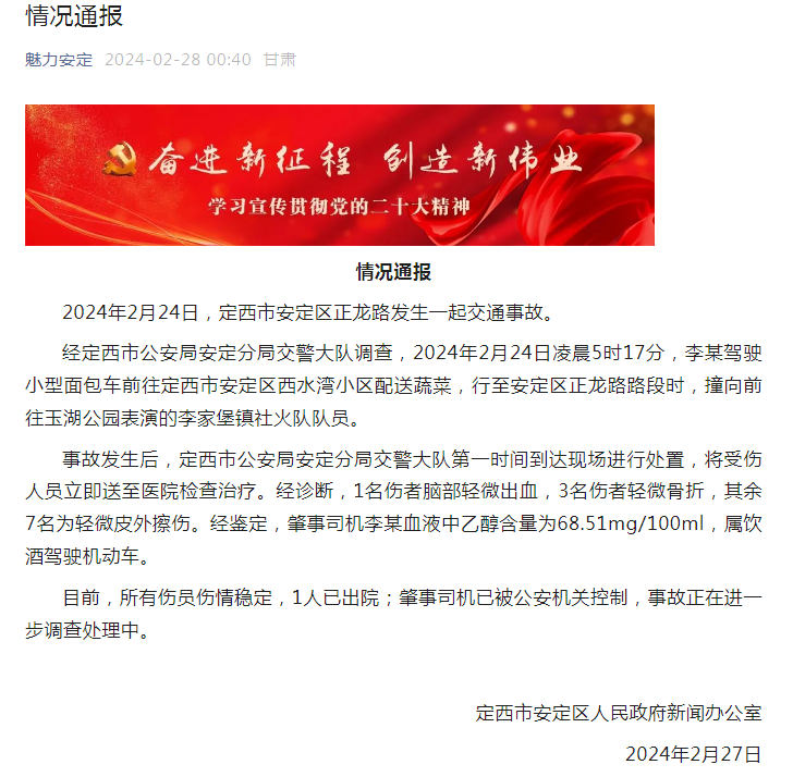 2月27日,有网民发视频称,2月24日,甘肃定西市一社火队伍遭面包车撞倒多人受伤,司机疑似酒驾。