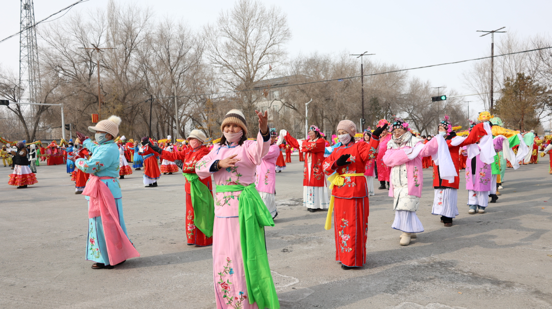 走进吉木萨尔县老台乡文化广场,广大文化活动爱好者排练舞龙、舞狮、二鬼摔跤、扭秧歌、打鼓等传统节目。演员们伴随着欢快的鼓点,或走或跳,舞动着手中的彩扇、长龙,一招一式饱含了对美好生活的热爱。