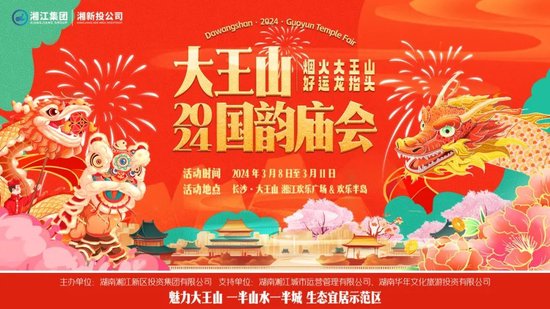 “烟火大王山,好运龙抬头!”由湘江集团湘新投公司主办的湖南省大型新春民俗节庆活动“2024大王山首届国韵庙会”,将于2024年3月8日至2024年3月11日在长沙大王山湘江欢乐广场和欢乐半岛举办。