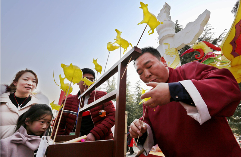 2月16日,市民在山西运城一公园内观看吹糖人。