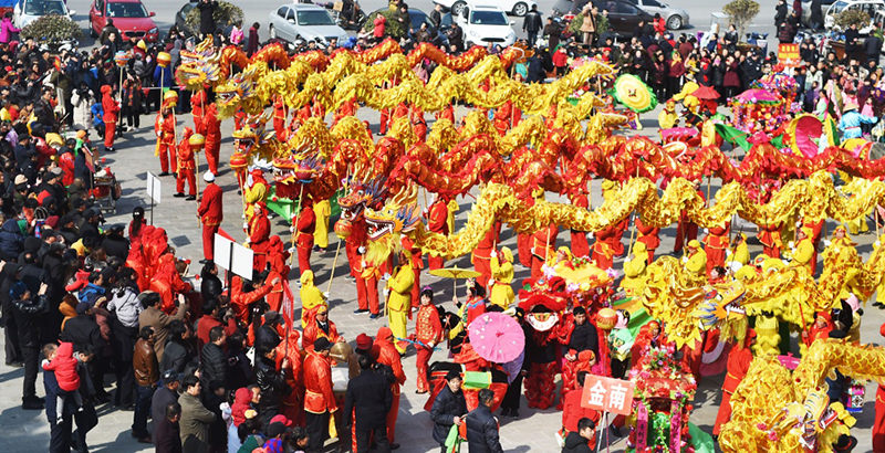 2月17日,河北遵化山里各庄村农民花会队在村广场表演舞龙。