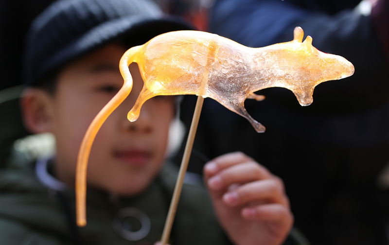 2月17日,在山东青岛天后宫新正民俗文化庙会上,一名小朋友在观看吹糖人制作。