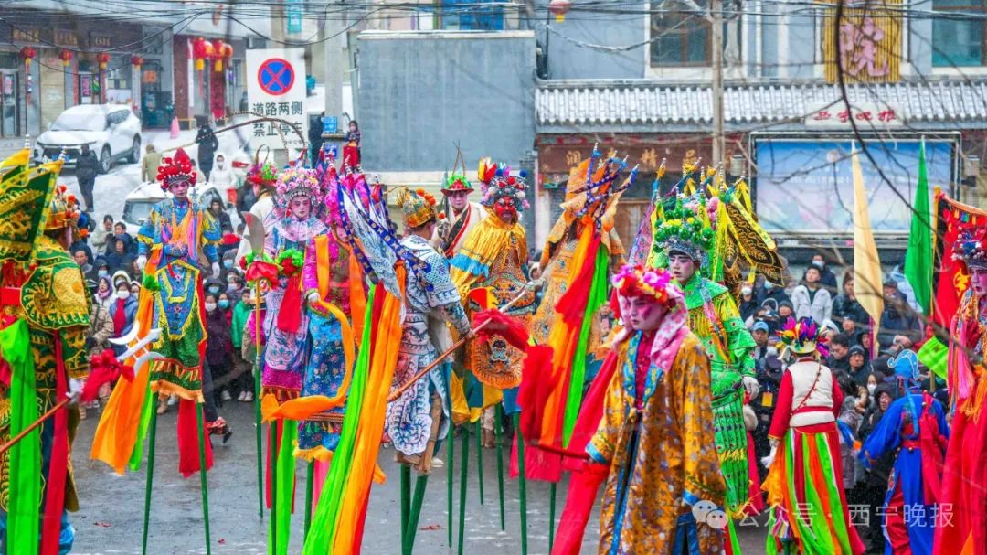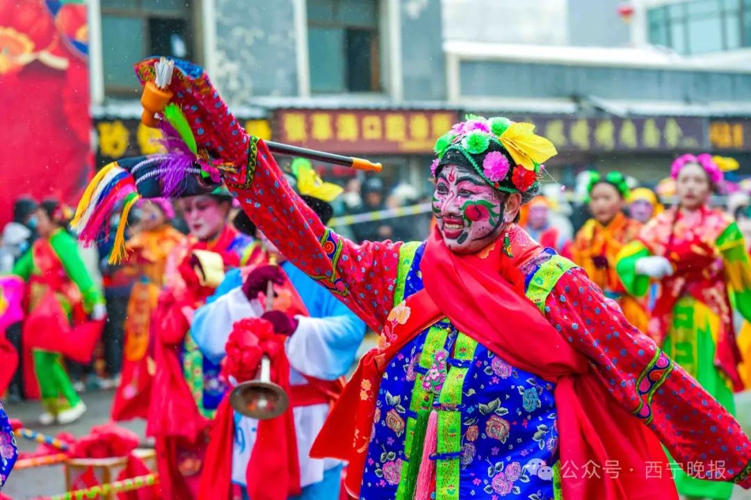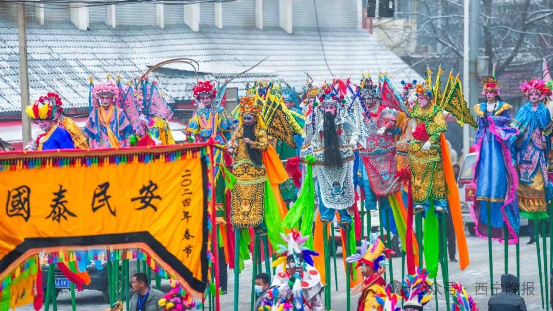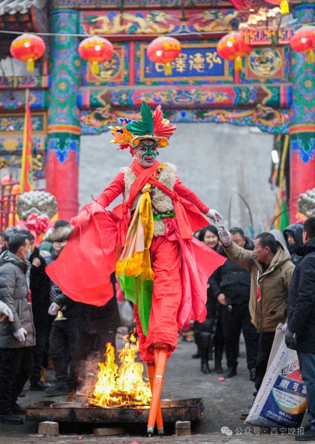 震天的锣鼓、腾飞的巨龙、威武的雄狮、喜庆的高跷……传统社火让过年的气氛铺满了大地,锣鼓震天、鞭炮齐鸣,彩旗飘扬,演员们载歌载舞中表达了群众迎新春、庆盛世的美好愿望。
