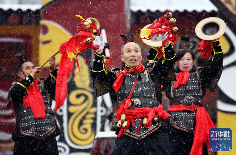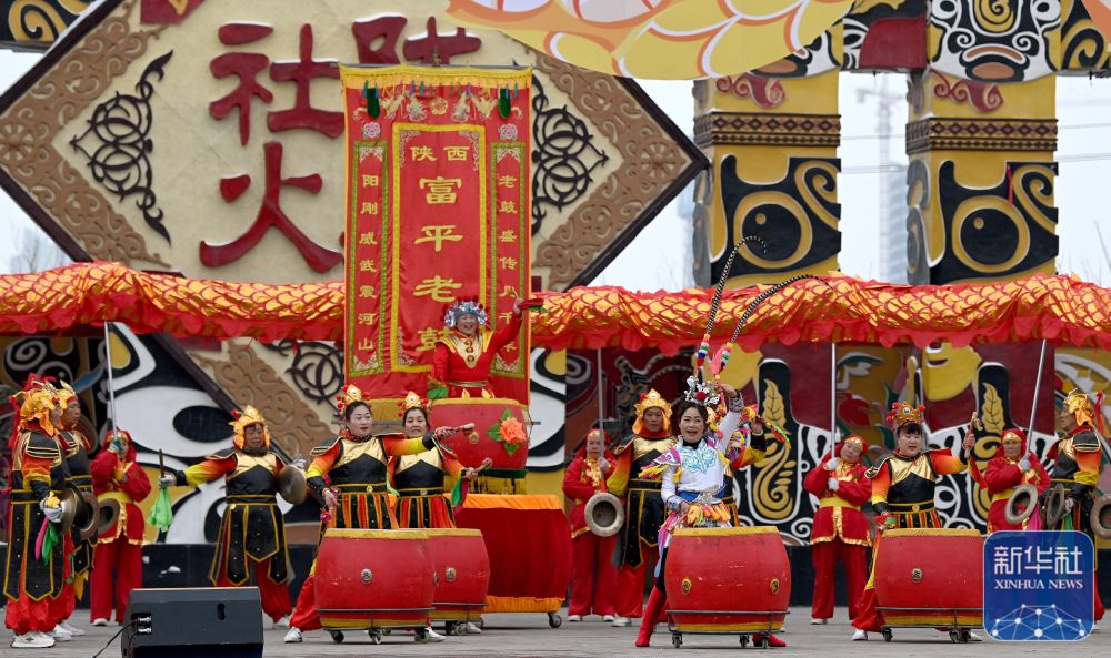 2月22日,在陇州社火过大年暨陕西省民间社火展演上,来自咸阳市的社火队在表演秦汉战鼓。