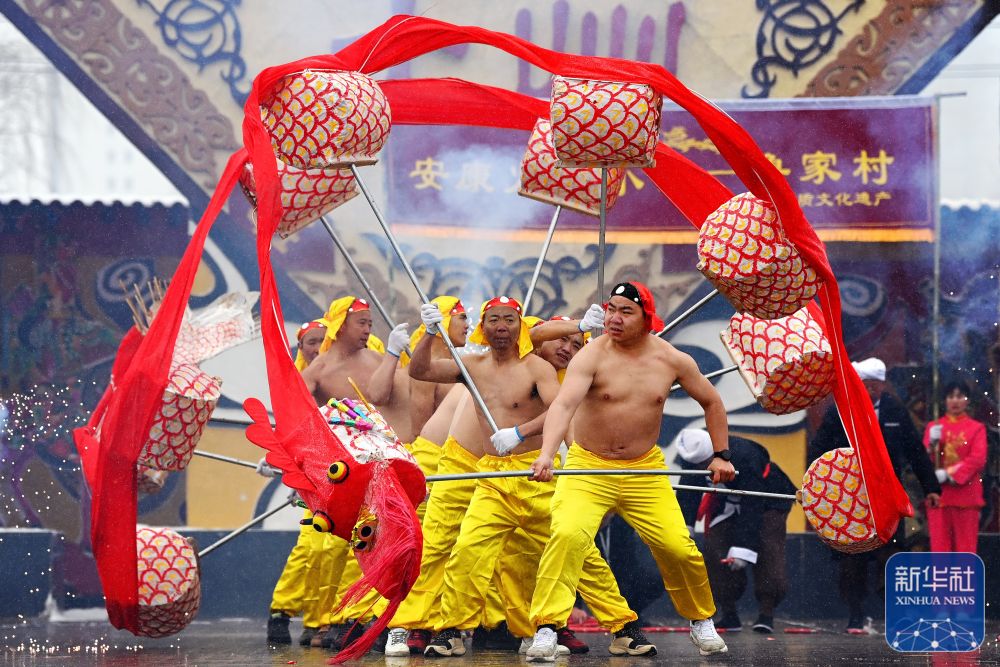 2月22日,在陇州社火过大年暨陕西省民间社火展演上,来自安康市汉滨区的社火队在表演鲁家村火龙。