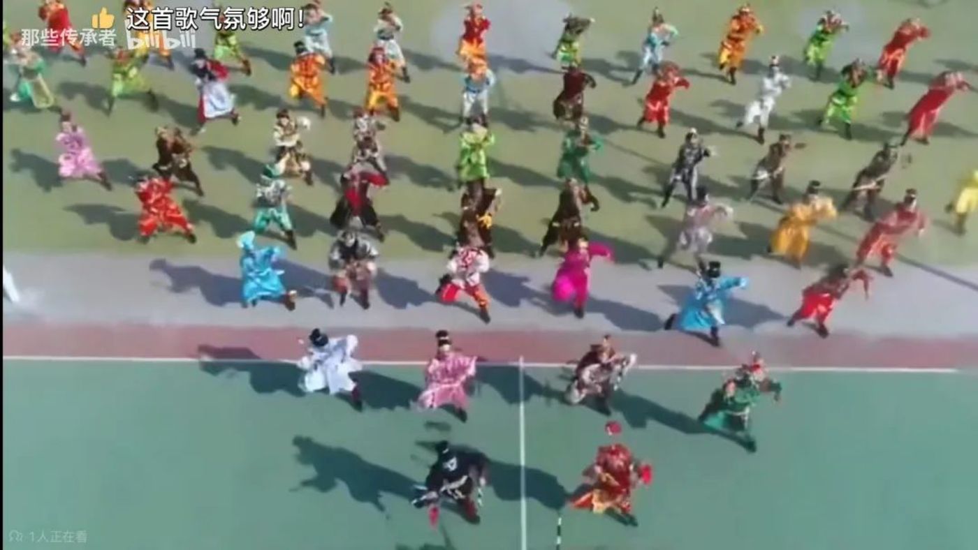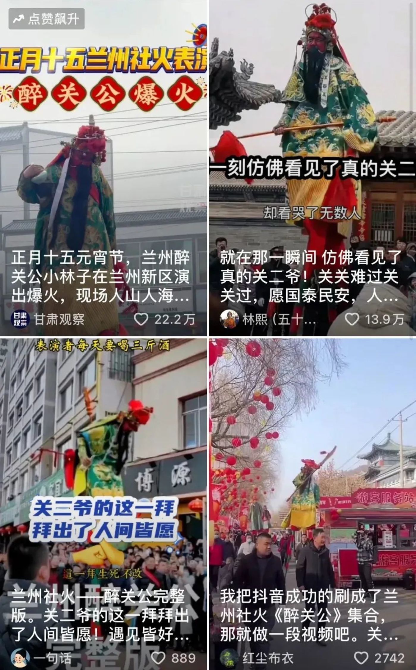 一时间,各平台上流传开这个醉关公的视频,不少网友还加上自己的解读进行二创,让社火表演在春节期间火速传播开来。